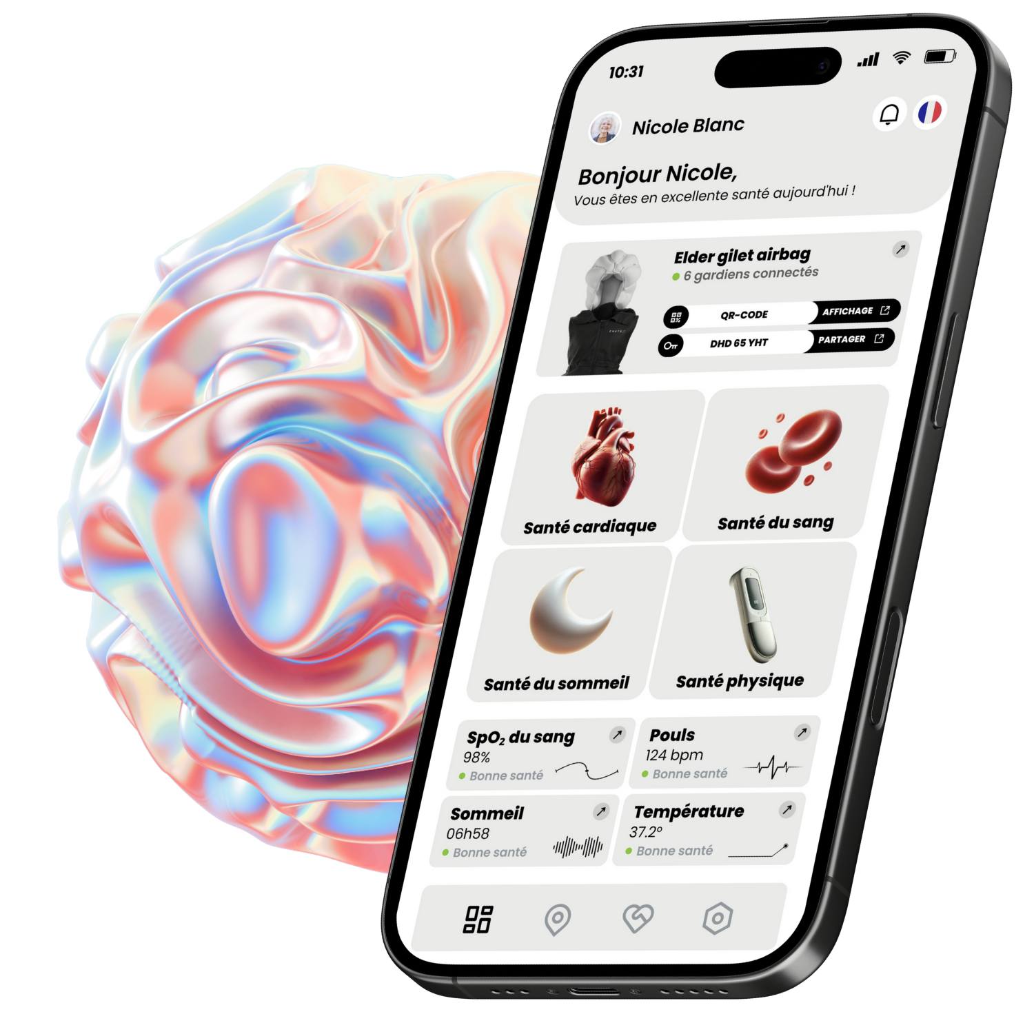 Suivi continu de la santé (rythme cardiaque, température, sommeil, activité…) avec partage en temps réel aux proches. Elio détecte les anomalies et alerte avant tout risque pour un bien-être préventif et connecté.